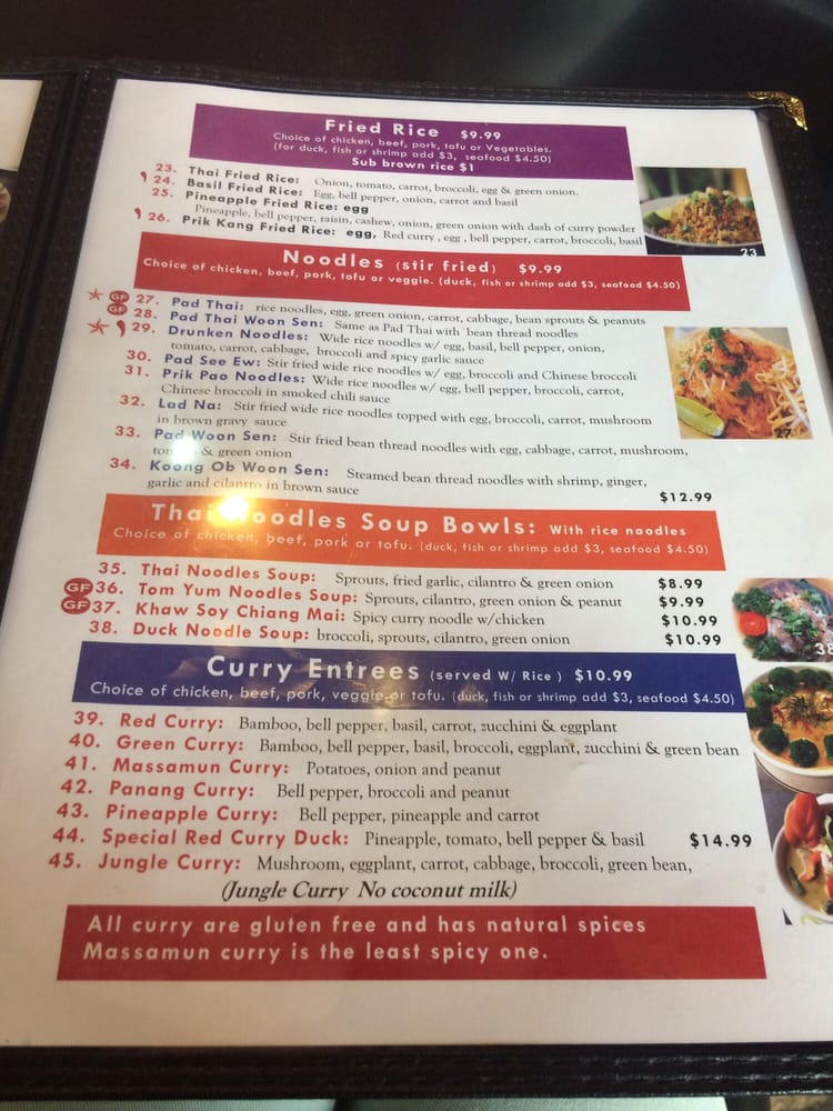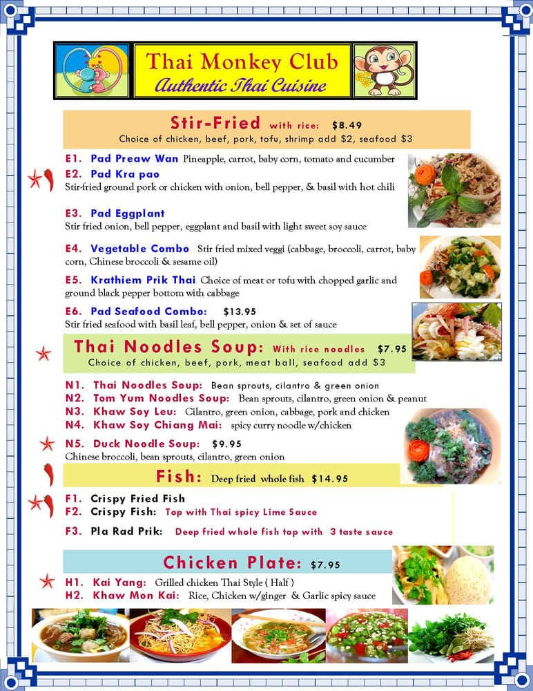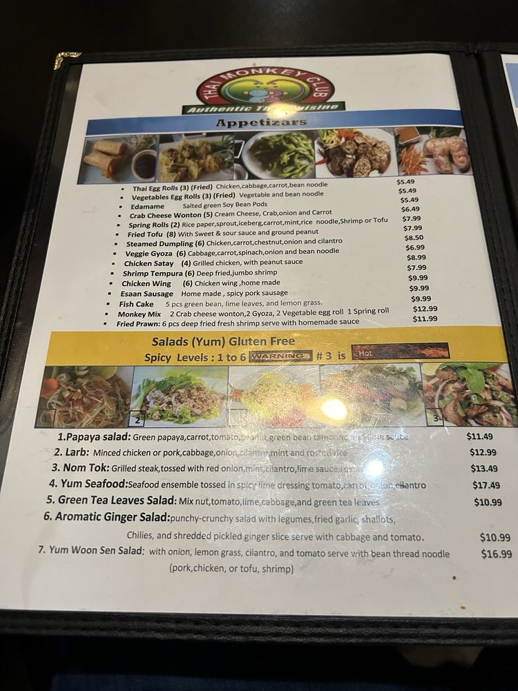 Located in Denver, Thai Monkey Club offers a diverse menu with a focus on authentic Thai cuisine. With features like delivery, takeout, reservations, and vegan options, this restaurant caters to a wide range of preferences. The appetizers range from classic Thai Egg Rolls to Crab Cheese Wontons. Their salads like Papaya Salad and Larb Salad showcase fresh ingredients and bold flavors. Soups like Tom Yum and Tom Kha deliver comforting and aromatic dishes. Customer reviews rave about the flavorful offerings, with dishes like red curry chicken, drunken noodles, and Panang curry standing out. The cozy ambiance adds to the overall dining experience, creating a homely and welcoming atmosphere. With generous portions and attentive service, Thai Monkey Club is a must-visit for Thai food enthusiasts.